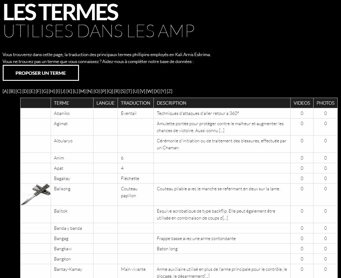 Le manque d'informations sur les Arts Martiaux Philippins en France était tellement important qu'il fallait faire quelque chose ! Bien sur, il existait des sites (mais souvent anglophones), bien sur il existait (et exite toujours) des pages Facebook pour échanger avec de très bon experts, mais nous voulions pouvoir réaliser un portail ou centraliser toutes les informations sur les styles, histoires, experts, et bien sur tous les évènements à travers la France et plus largement à travers le monde.